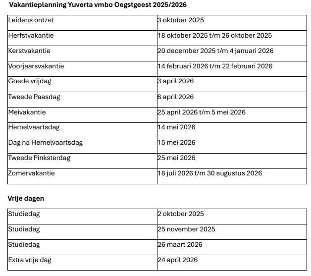 Elke school heeft een schoolgids waarin je meer kunt lezen over het onderwijs. Hierin staat ook veel praktische en belangrijke informatie over het schooljaar. De schoolgids wordt aan het begin van ieder schooljaar via ons intranet (Yunet) met ouders en leerlingen gedeeld. Benieuwd? Lees de algemene schoolgids van Yuverta of de specifieke schoolgids locatiedeel Yuverta vmbo Oegstgeest.pdf